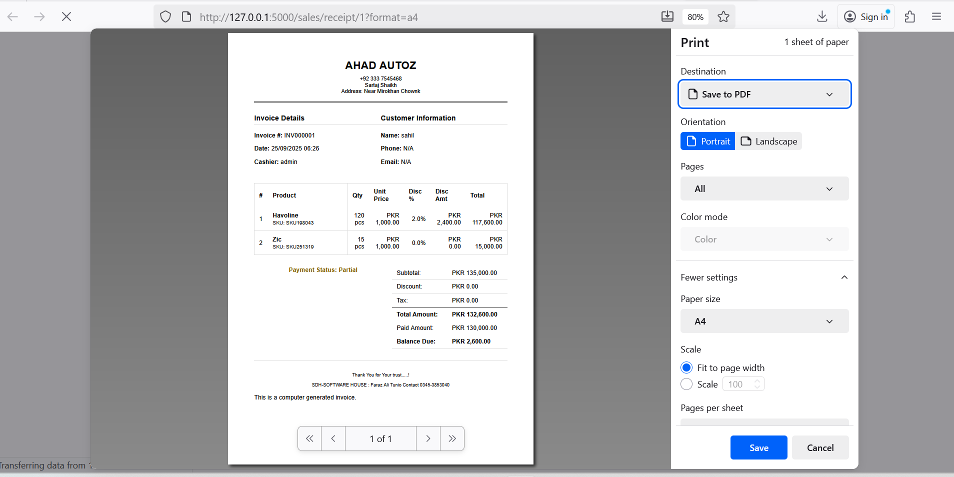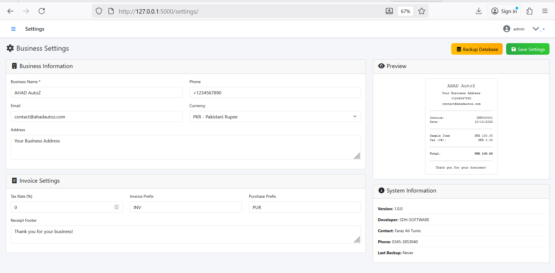 On first launch, enter your business details (name, tax %, address, logo, etc.) and the system automatically customizes invoices and receipts with your brand identity.