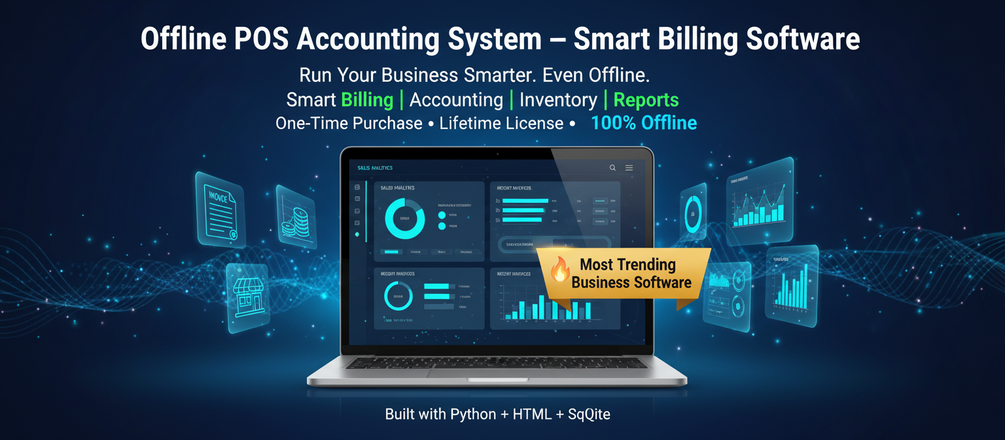 The Offline POS Accounting System is a complete all-in-one billing, accounting, and inventory solution built with Python, HTML, CSS, JS, and SQLite β made for shop owners, wholesalers, small businesses, and freelancers who want fast, secure, and offline control of their business.